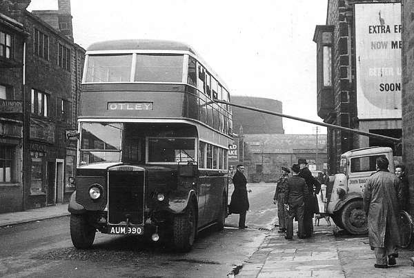 A nasty accident which occurred in 1947 in Bondgate, Otley. This fine Samuel Ledgard all Leyland TD4 was just pulling over to the right to turn into the Crossgate Bus Station when the lorry emerged from the narrowest of alleys with this ridiculous and illegally unmarked pole protruding into the road as shown. Mercifully no passengers were sitting near any of the shattered windows or the outcome doesn’t bear thinking about – surely decapitation could have been a possibility. The tall fellow in the trilby hat is almost certainly Mr. Jack Tapscott, the highly efficient manager of Otley depot whose tireless efforts and dedication ensured a top class service for generations of passengers.