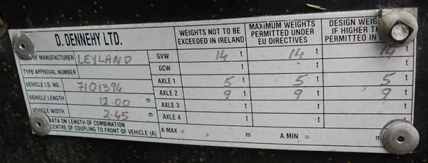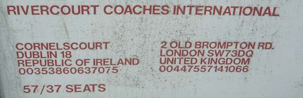 There is legal lettering for Rivercourt Coaches International for London and Dublin addresses and a fleet no. 355. I have not been able to find this company. Also there is a cast alloy plaque just above the legal lettering with the number M2083, which might be a PSV licence of some sort perhaps, but then the only indication of the coach being operated by anyone in Ireland is suggested by the Rivercourt Coaches details.