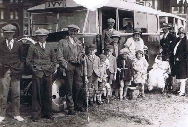 I was just looking at the photo of all the people sat in the charabanc off on an outing and the driver in his cap with a white cover. It reminded me of a story my grandmother once told me about the day they went to Blackpool in a charabanc like the one in the photo. They sat behind the driver for the trip. On the way back the driver leaned over his shoulder and said to my grandmother “madam can you please turn mi hat round” My gran thought it was a bit odd but with the wind and everything she said “Certainly” So they drove on for a while, the driver with his hat back to front. Finally after a few miles he turned round further and said over his shoulder “Madam” so my gran leaned forward “I said can you please pass mi hat round.” My gran had completely miss heard him with all the wind noise and rattling with the solid tyres.