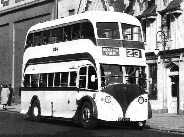 Registration DFV 144 fleet number 244 was a 1949 Leyland Titan PD2/5 with Burlingham FH31/23C bodywork.