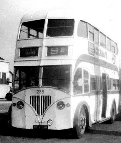 Registration DFV 138 fleet number 238 was a 1949 Leyland Titan PD2/5 with Burlingham FH31/23C bodywork.