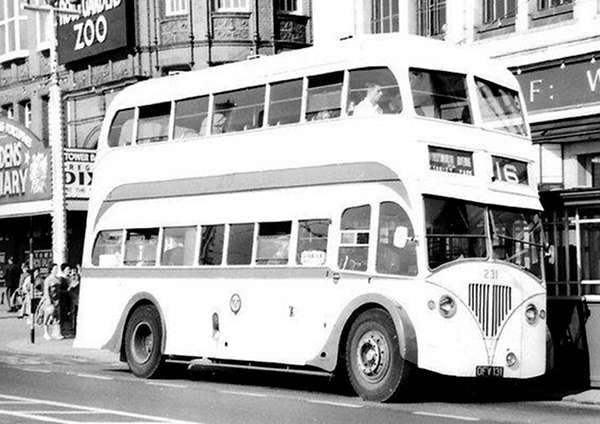 Registration DFV 131 fleet number 231 was a 1949 Leyland Titan PD2/5 with Burlingham FH31/23C bodywork.