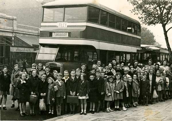 Some of the children are carrying what appears to be more than just the requirements of a day out, so maybe the bus(es) in the photo are purely incidental?
