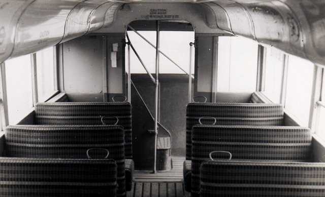 It seems that upstairs there were 8 rows of 3 seats each, and the rearward-looking view of the lower saloon reveals a low arch (but not quite as low as the side gangways) just as you step down onto the platform, which would be the consequence of having a partly-sunken cross-gangway across the forward end of the platform. John confirms that the stairs were pretty tight, as they would need to be to reach gangway height at a point that would still allow room for this putative cross-gangway within the platform well. John tells me that he recalls (at the age of six!) the rearmost seat upstairs being immediately in front of the emergency window, but I would have thought that would limit headroom over the stairs.
