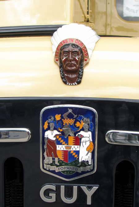 Guy Motors had a motto “Feathers in our cap”, which they were using as an advertising slogan as early as the 1920s, and the Indian head and headdress was related to that. The earliest version I can find reference to was on a B-type single decker supplied to Burton on Trent Corporation in 1928. It was used more frequently after the war.