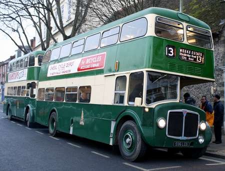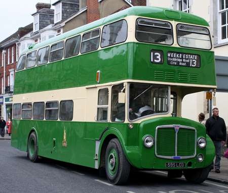 595 and 596 LCG are AEC Renown 3B2RA vehicles with Park Royal H72F bodywork from the fleet of King Alfred Motor Services of Winchester, and date from 1964. They are both seen during one of the famous Running Days on 1 January 2009. Note the different applications of the livery.