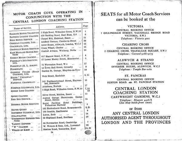 The June 1930 Timetable of the Central London Coaching Station includes a map of its location and a list of the operators serving it. Of those listed, none survive although the present day East Midland is the successor to the original company but not the same legal entity. Quest Motors of Maldon gave up its PSV work (twice!) but survives as a car dealer in that town.