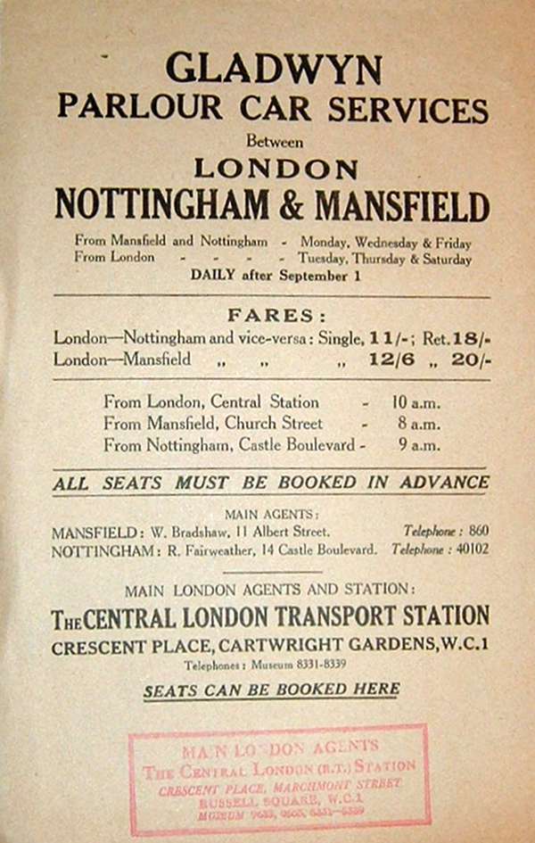 Information received off-site (thanks Clive) seems to suggest that Gladwyn were a short lived operation, incorporated May 1928, limited November 1928 and liquidated May 1929! Ebor are on the scene in October 1930. I have been provided with a flyer/handbill detailing the service but it carries few actual details that really matter, no depot or office is mentioned, just three ‘agents’ and only departure times from Mansfield, Nottingham and London.