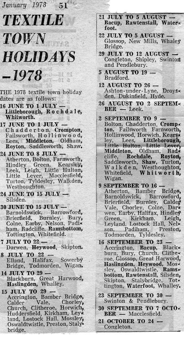 I have in my collection a list of the holiday dates for the Lancashire towns for Summer 1978 which is attached herewith. It was originally published in the ‘Rochdale Observer’ local newspaper during January 1978.